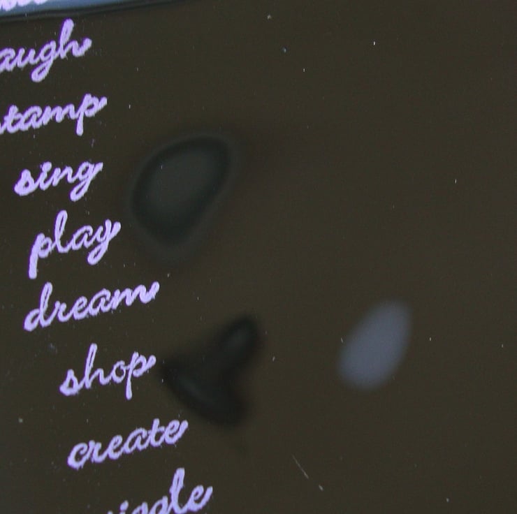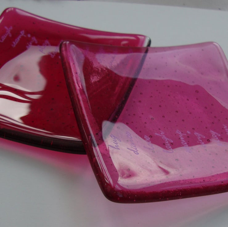 these dishes have a variety of words fused onto them such as laugh stamp sing play and dream.
