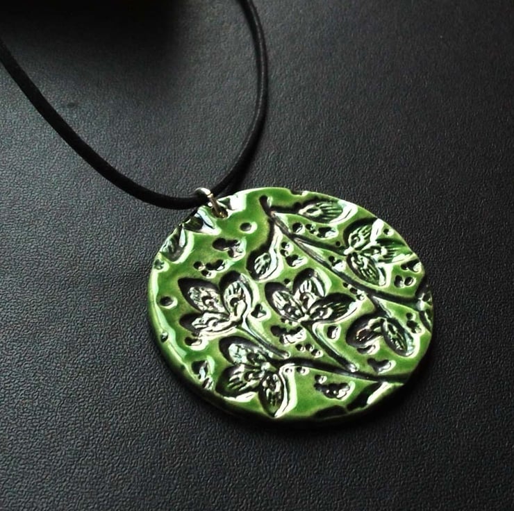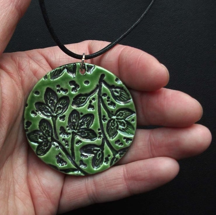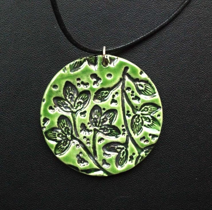 This leafy patterned pendant is made from white earthenware clay, embossed with pattern and fired once. It is then coated in a rich, glossy green glaze and fired again to 1100 degrees, so it is nice and strong.