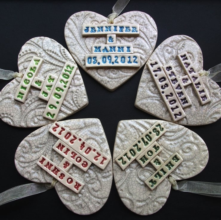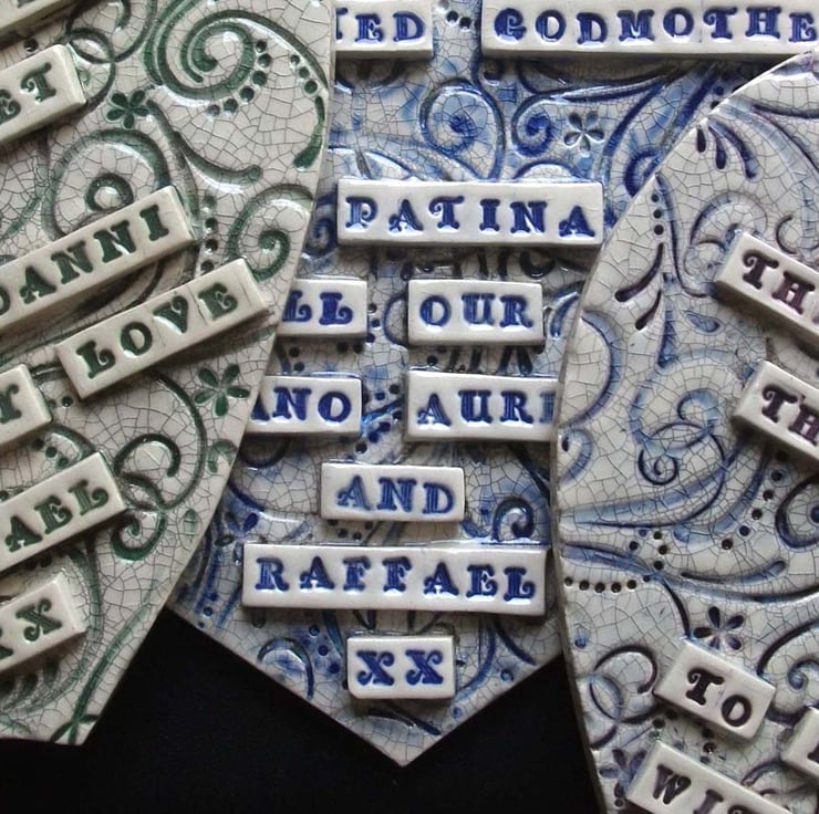 I have a variety of different colours for the words as shown in the photograph with the small hearts. I prefer to leave the background swirls just plain now (with just the crackle glaze on top - as shown in the small heart photograph) as I did have problems with the colour smudging, so unless you state a preference for a coloured background - I will leave it cream and swirly.