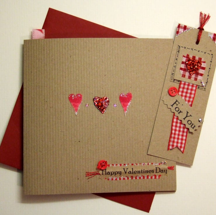 A tag saying, 'Happy Valentines Day' is on the front of the card and a small message tag is attached on the front of the bookmark saying, 'For You' or '4U'