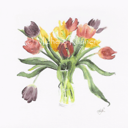 This card has been created from an original Watercolour painting, and features a vase of colourful tulips against a white background.