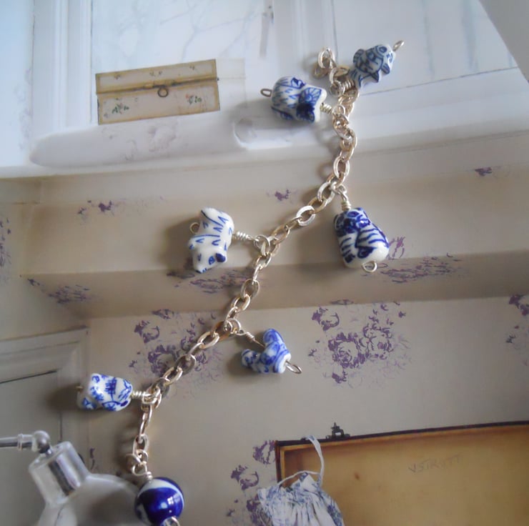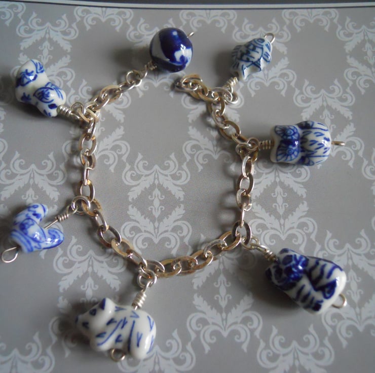 Super cute sterling silver bracelet with 7 little blue and white porcelain animals.