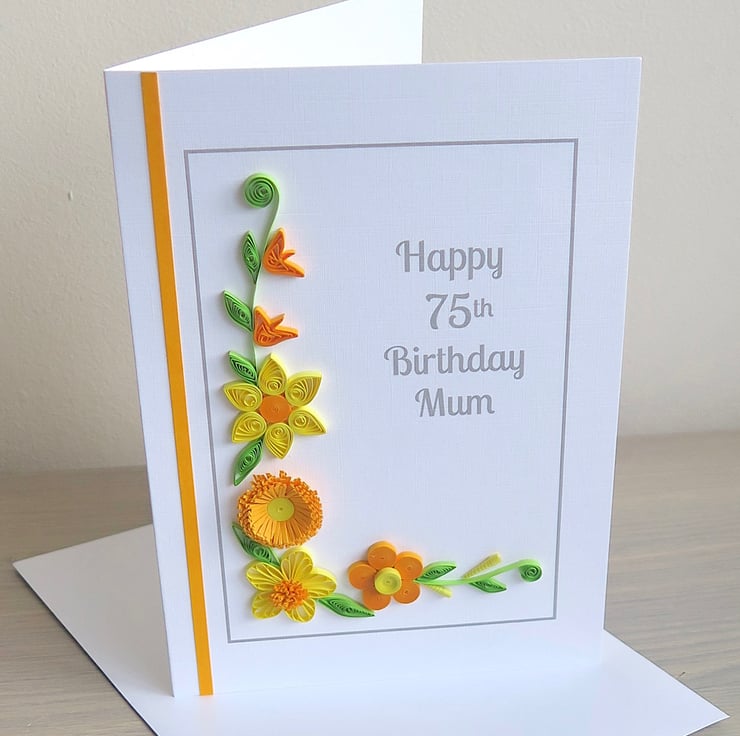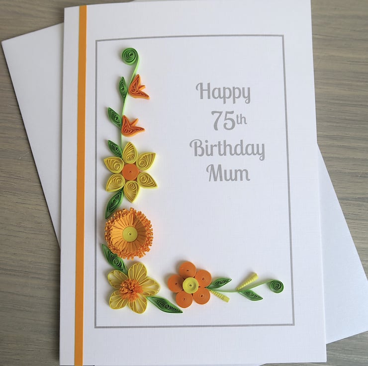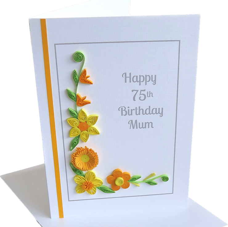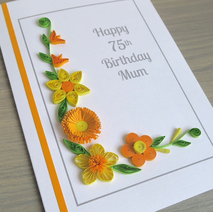 Handmade 75th Birthday card with quilled flowers and personalised message