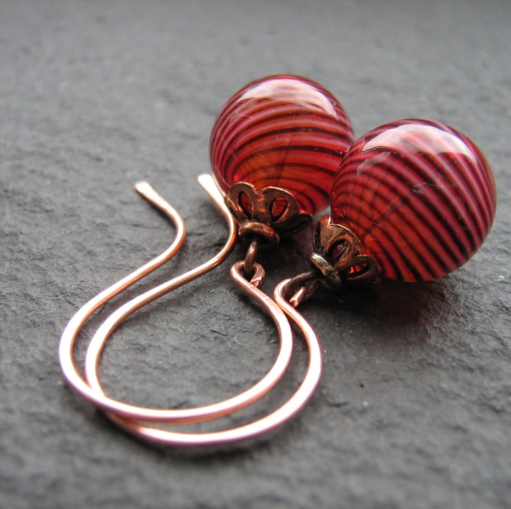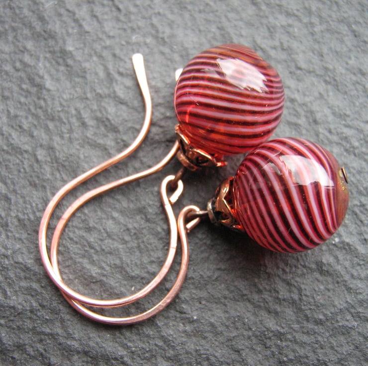These beautiful blown glass beads (12mm) hang from handcrafted copper ear hooks. They are stunning in their own right and are sure to attract attention with their unusual design. They would make the perfect gift for lovers of handmade jewellery, or just a treat for yourself!