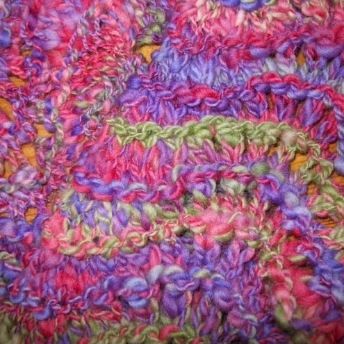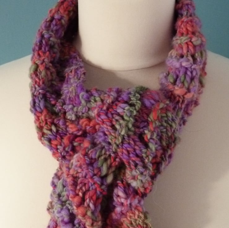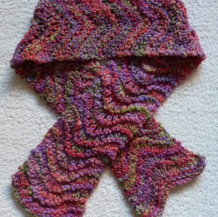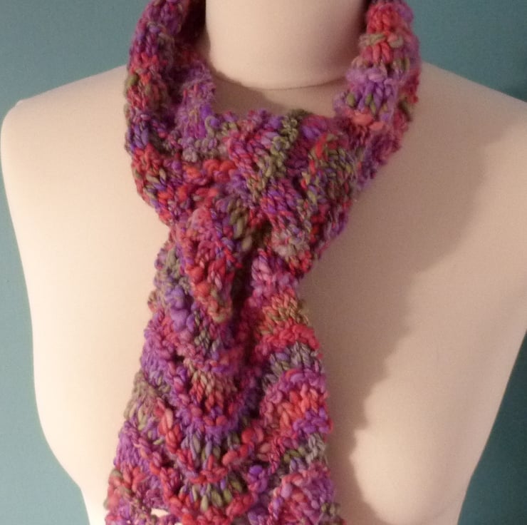 I started by hand dyeing the merino fibre in shades of pink, purple and green, and then handspun the worsted weight yarn for this scarf . I have hand knit the yarn in a fan lace pattern to compliment the slub effect of the yarn. It is 100% merino wool and is beautifully soft to the touch. It measures 5.5" wide by 42" long. The scarf would make a wonderful addition to your wardrobe, or a fantastic present.