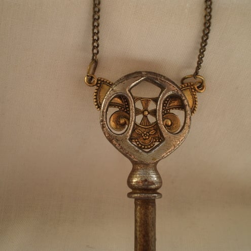 A wonderful Antique key which has long gone been separated from the lock it once opened.... but it is still a beautiful object. A unique piece of history to wear... tell a story of a secret garden door that it opens. Resting on an antique finish finding to add that delicate touch. I wear one of these and it always evokes a question or two...