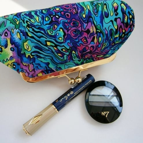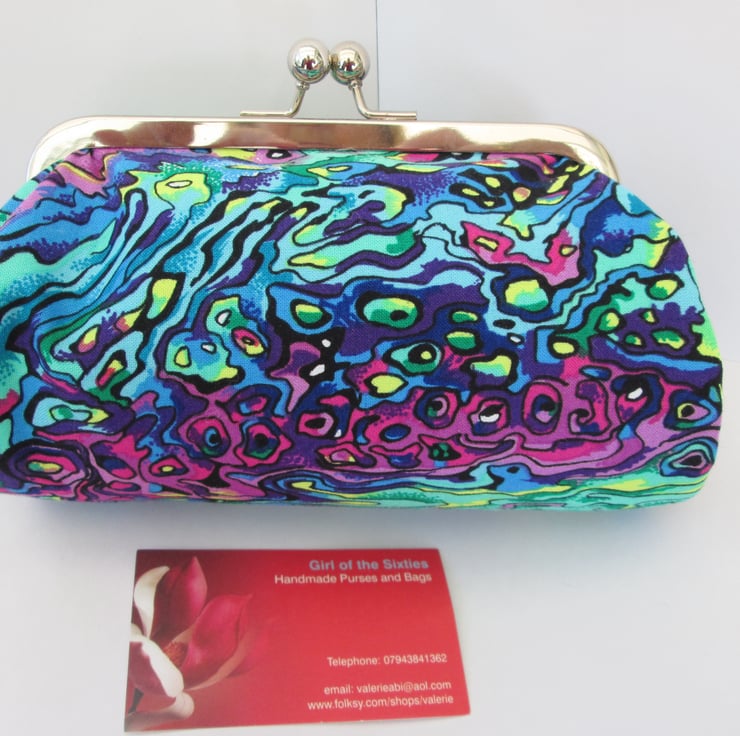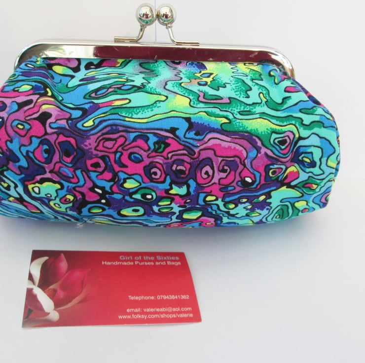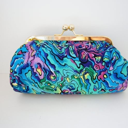 Perfect little clutch for your mobile phone, keys, sunglasses,change and credit cards or even a make-up bag. Pretty Pacific Paua shell fabric from New Zealand with contrasting lining, padding and silver metal frame clasp.