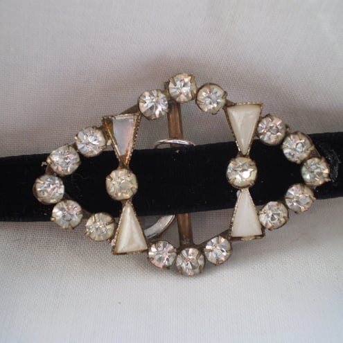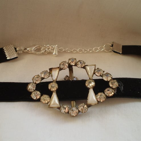 This beautuful Art Deco buckle once adorned the waist of a lady long ago and was abandoned in it's original purpose down the decades... Why cannot this wonderful beauty not now adorn the neck of a modern Vintage lover of all things of that era. it is just elegant in it's design and the plain black velvet choker shows it to perfection. All the stones are present and bright. A perfect gift for Mothers day!!
