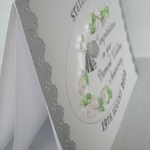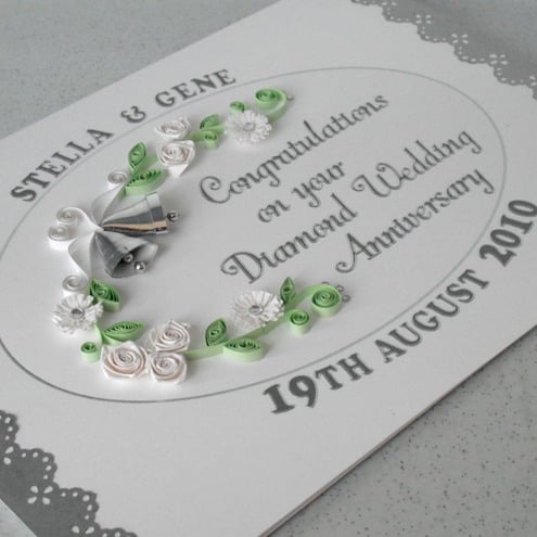 A beautiful quilled diamond wedding anniversary card with quilled flowers and bells, perfect for helping a special couple celebrate a milestone anniversary.