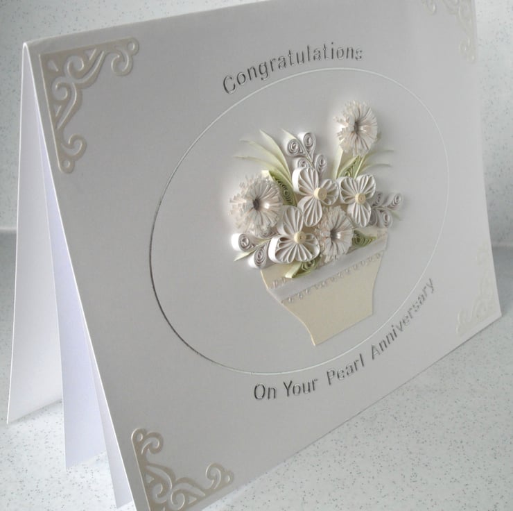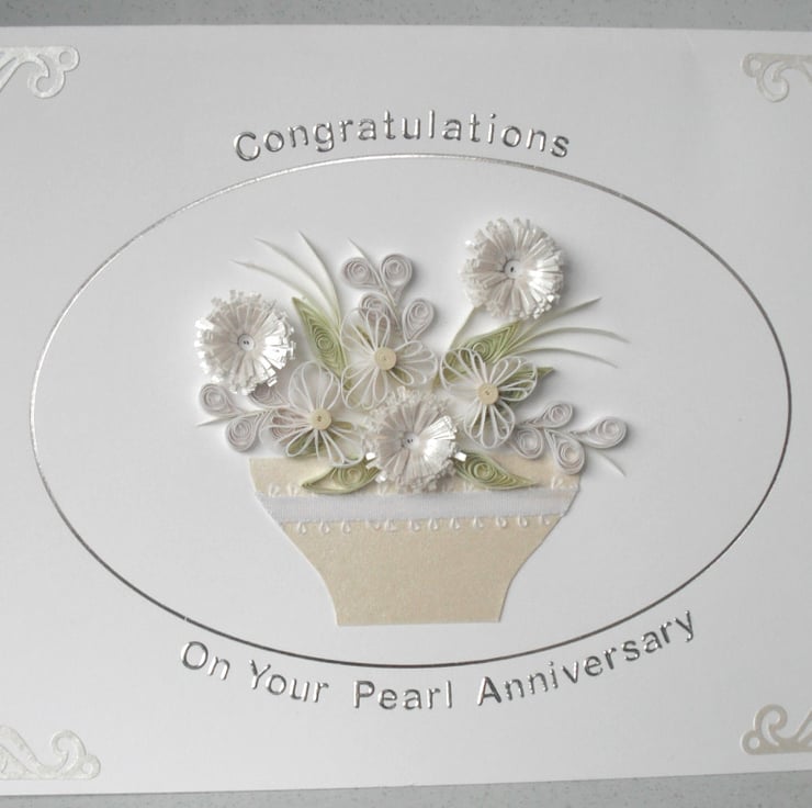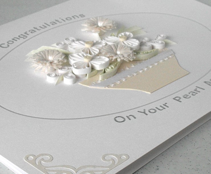 A beautiful handmade quilled 30th anniversary card with paper quilling flowers. Perfect for helping a special couple celebrate their pearl anniversary.