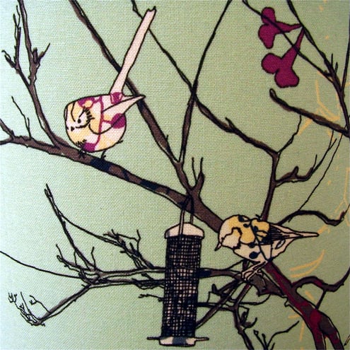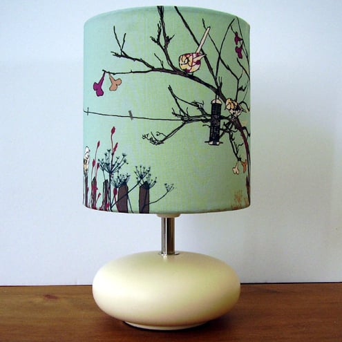 This design is inspired by my allotment and some of its visitors. It has been digitally printed onto a quilting weight cotton, backed onto heatproof, natural, lampshade parchment and bonded onto a 6" diameter lamp frame. The shade is shown here for illustrative purposes only on a bedside lamp available from Argos.