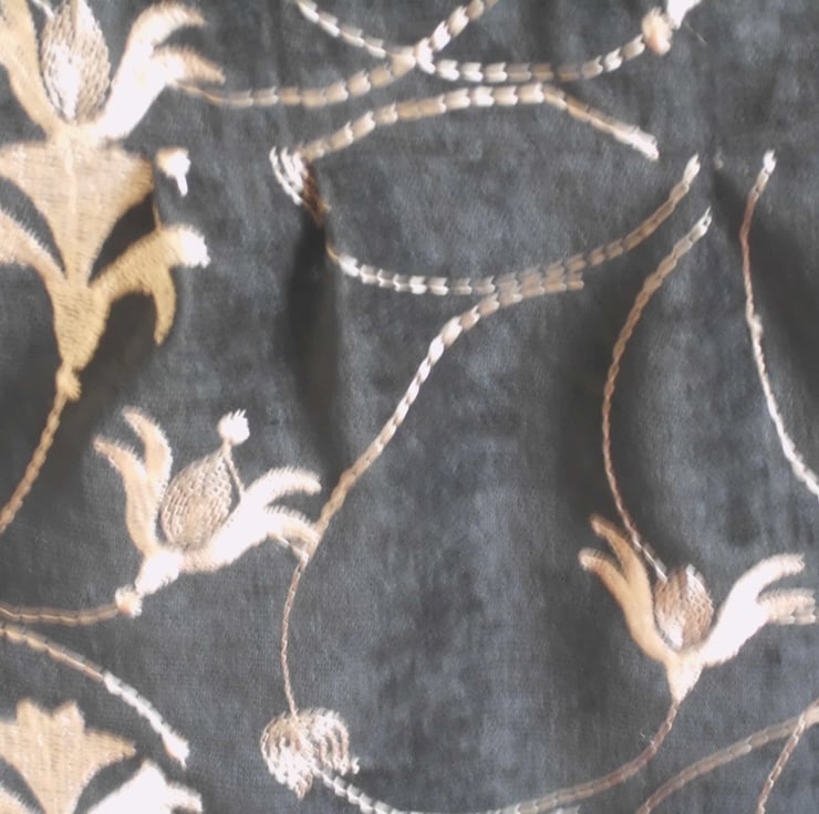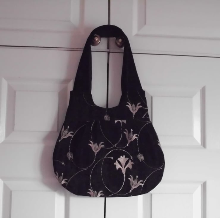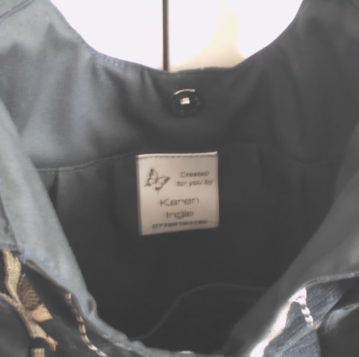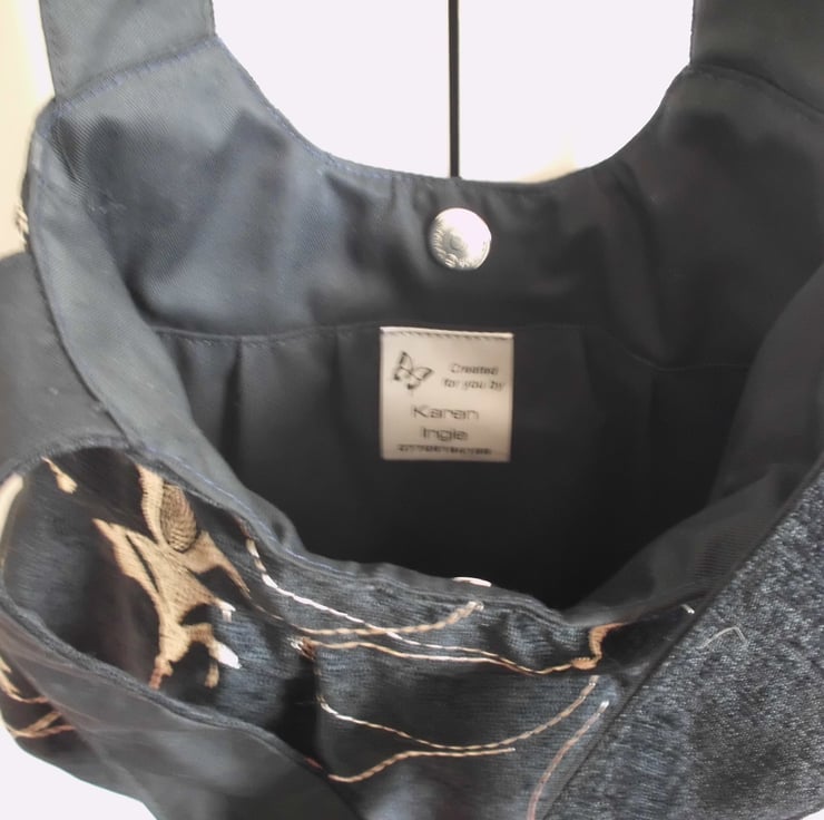 This bag is made in a Soft black furnishing fabric with gold embroidery design flowers. It has a Black cotton lining with a patch pocket and a magnetic clip .