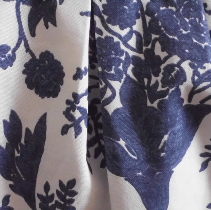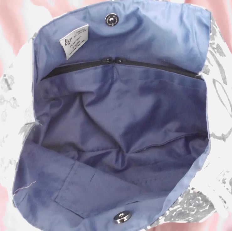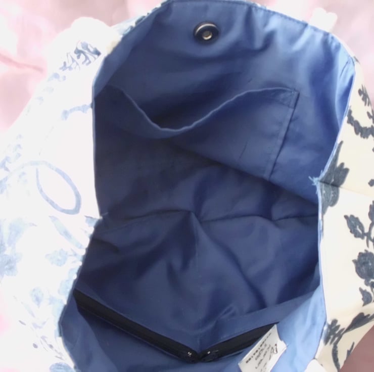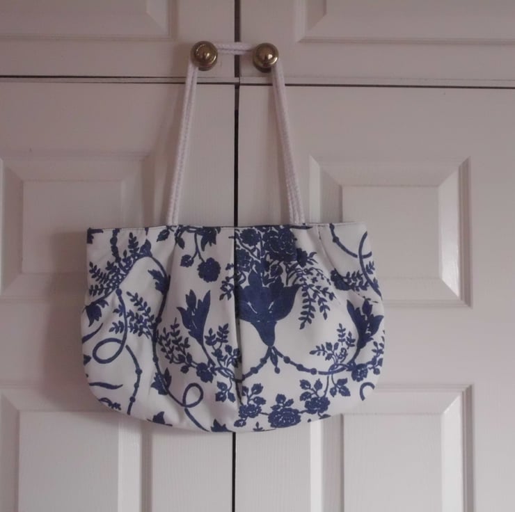 Blue and white hand bag with rope handles made from cotton material with a flower print four pleates to give shape Blue cotton lining with 5 pockets one patch pocket two with zips.Magnetic clip This bag is ideal for work , shopping ,days out or every day it looks good with jeans a summer dress or white linen trousers,it would make an ideal holiday flight bag.