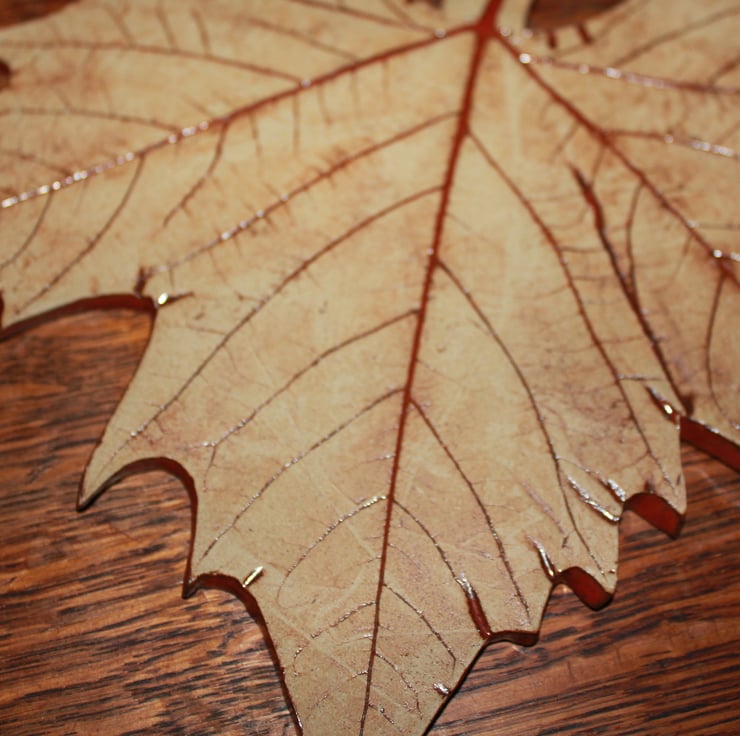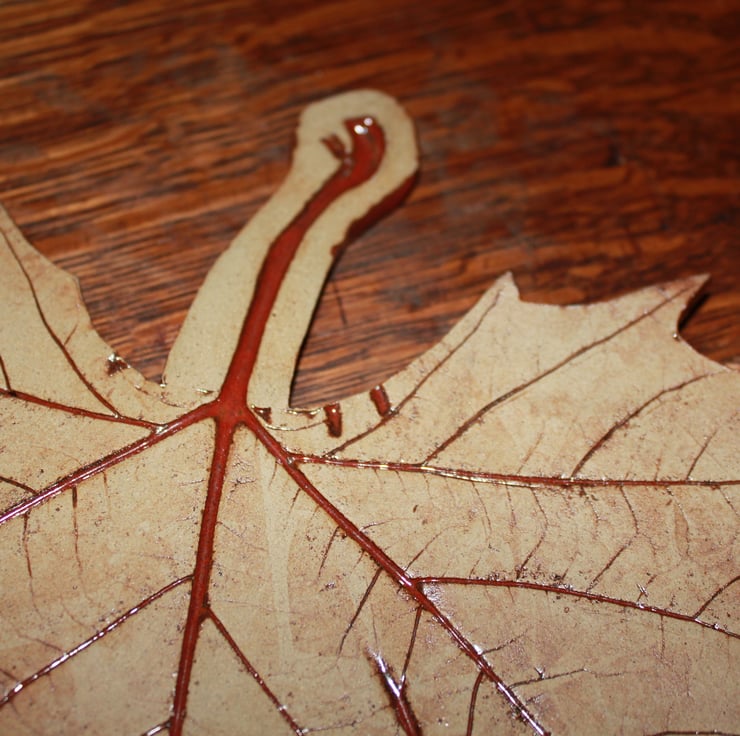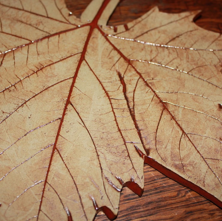 Handmade ceramic leaf , leaf impressed into the surface of a slab of rolled out stoneware clay, biscuit fired & then glazed using a red metallic shiney glaze, this glaze is wiped away to leave glaze in the impressions on the surface, picking up on the leaf vein impressions in the clay.