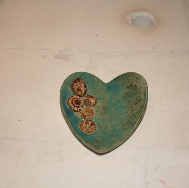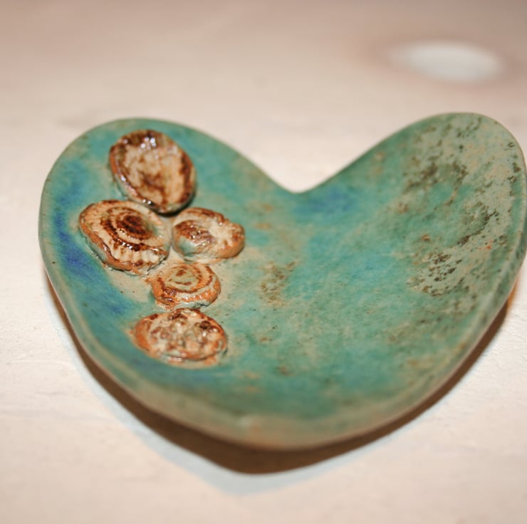 CUSTOMER ORDER DO NOT BUY Heart ceramic small dish with small shell, coral & ammonite decoration to one side, small dish made with stoneware clay & finished with turquoise matt glaze & hint of red on small decoration area.