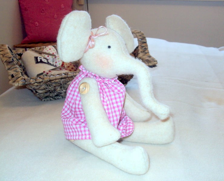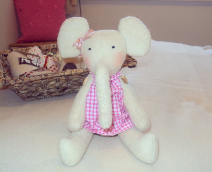 Cute hand-made elephant, made with a 100% natural Cotswold wool fabric. The legs and arms of the elephant are attached to the body with natural wooden buttons, which enables the legs to move into a sitting position. The eyes are embroidered. The elephant is then finished off with a dress made from pink gingham fabric, and a cute pink ribbon bow tied around her ear.