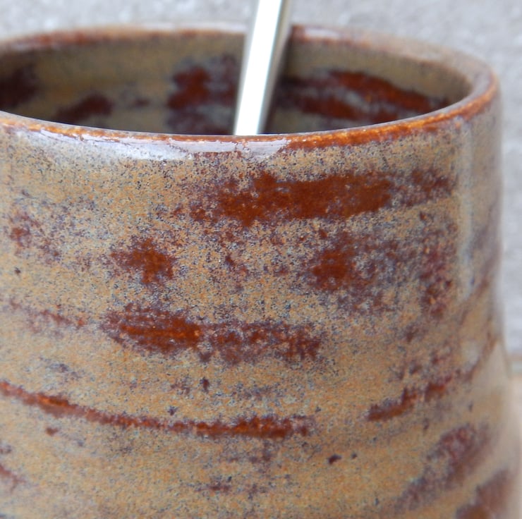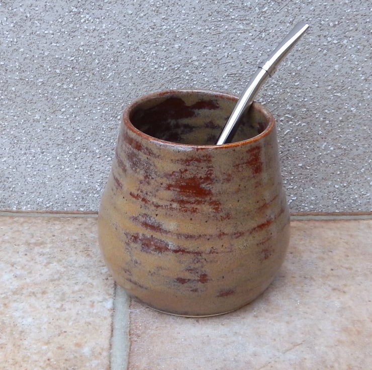 Yerba mate is the national drink of Argentina, Paraguay, Uruguay, and Southern Brazil where it is consumed 6 to 1 over coffee. Yerba Mate has the “strength of coffee, the health benefits of tea, and the euphoria of chocolate" all in one beverage. Of the six commonly used stimulants in the world: coffee, tea, kola nut, cocoa and guarana, yerba mate triumphs as the most balanced, delivering both energy and nutrition. This gourd, or calabash, was wheelthrown by me using strong rustic stoneware clay, and finished in a lovely mottled iron rust brown reactive glaze. It holds about 400ml of liquid and stands 7cm across the rim and 9.5cm high. Weight 365gm. Foodsafe glazes....dishwasher, oven and microwave safe. This listing includes a free bombilla, or masassa, drinking straw. I am happy to post anywhere---contact me for more specific prices, and I offer a combined shipping discount....applied at checkout. Thanks for looking.