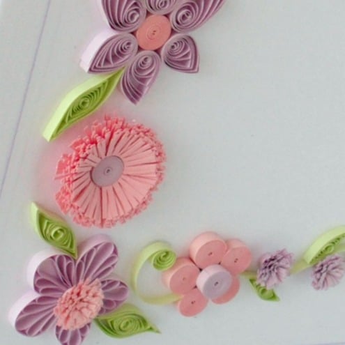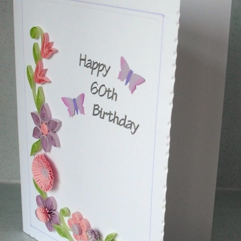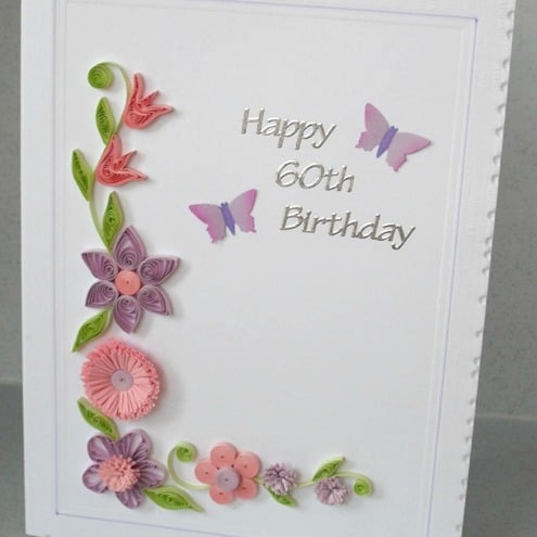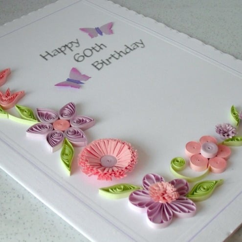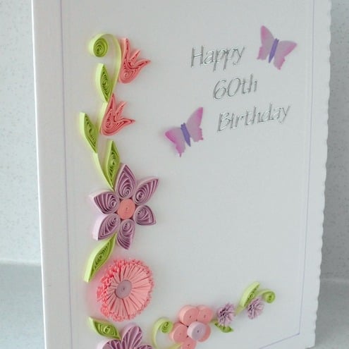All the quilling on this card is handmade! Each petal, bloom and leaf is handrolled from strips of coloured paper. The result is a beautiful original 60th birthday card which makes a great keepsake for the future.