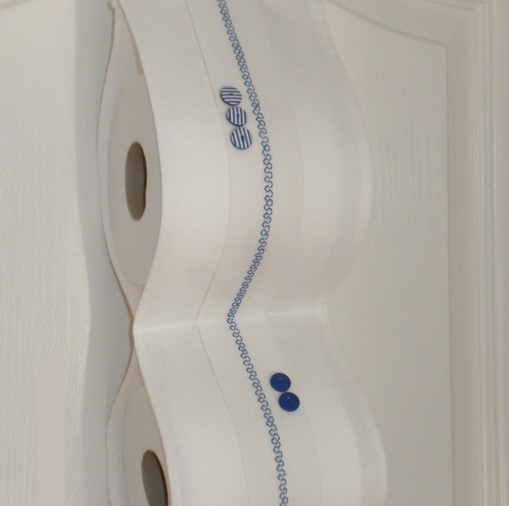 This item was neatly sewn with a blue top stitch thread in the middle of a pleated centre, with stripey and plain blue buttons carefully arranged at intervals. It brings a modern and fresh feel to your bathroom, toilet or kitchen.