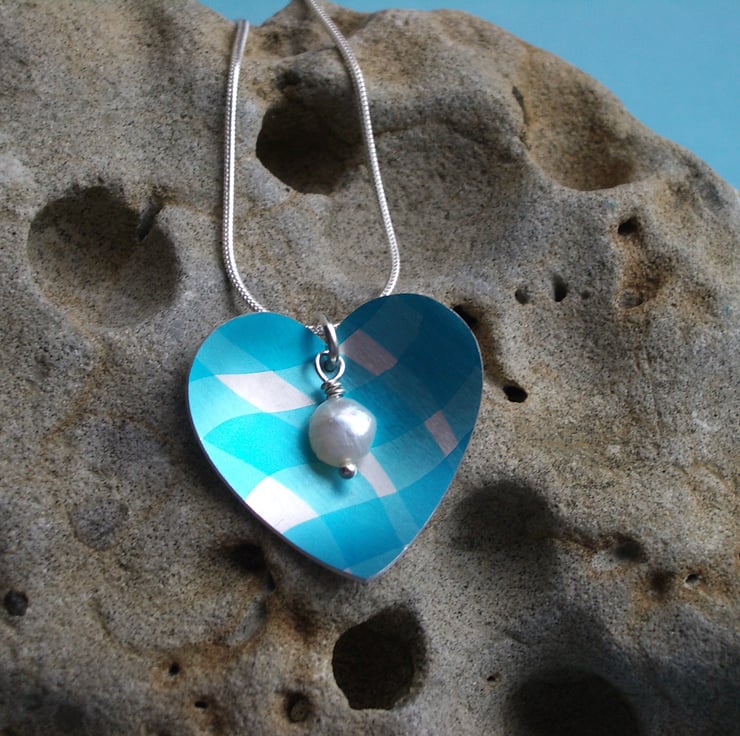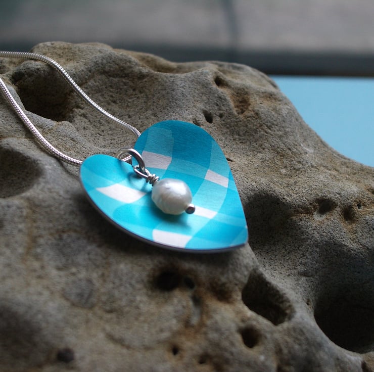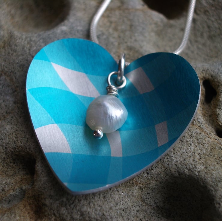 This turquoise heart shaped pendant, is made from aluminium which has been coloured and then sealed so that the dye becomes a permanent part of the metal. I then saw pierce the heart shape by hand.