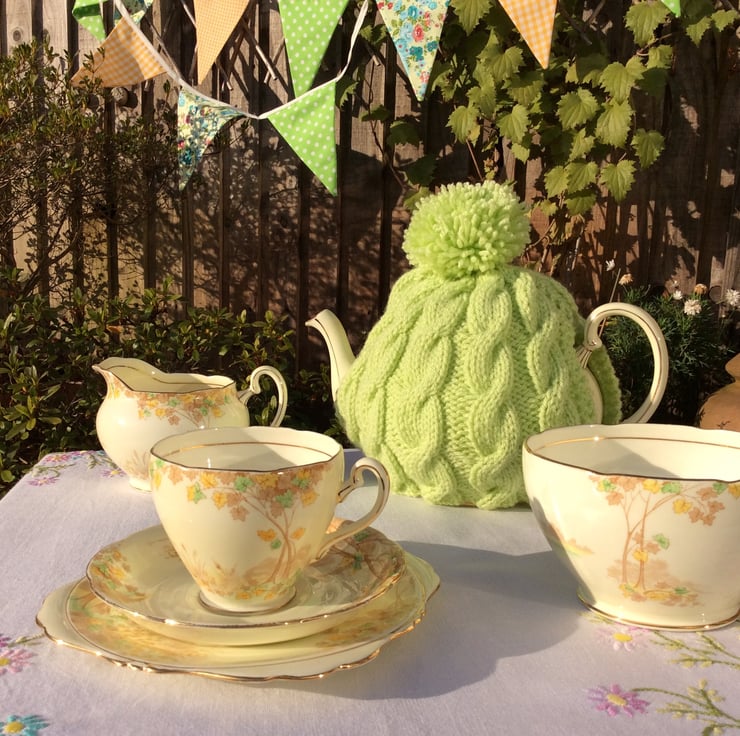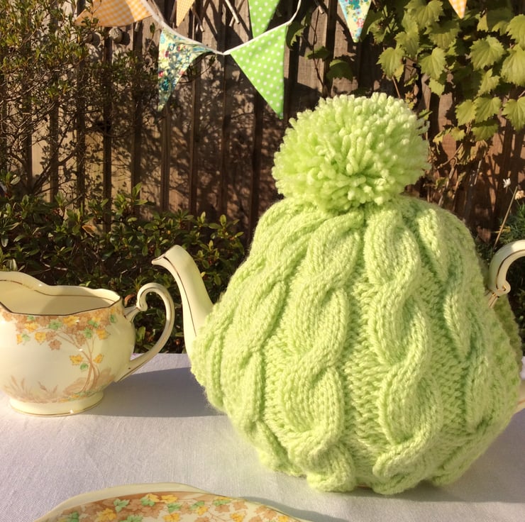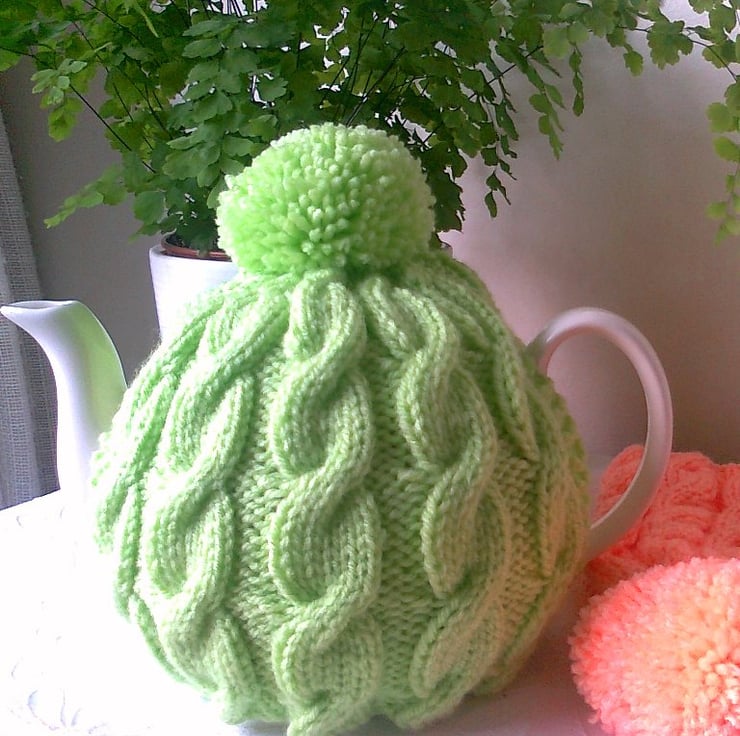 My new Spring Pastels Tea Cosy range has arrived with this cable cosy with bobble in a sherbet lime colour. Designed to fit up to and including a 4/6 cup pot. It is made from a wool/acrylic mix, this allows it to be machine washed, and tumble dried on a cool seting, though, I would generally recommend handwashing to keep it better in a better shape.