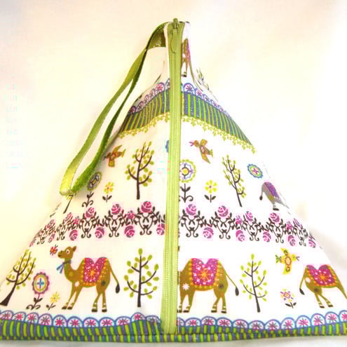 Sewn in beautiful designer fabric, these gorgeous Pyramid Project Bags measure 7 high x 7 wide. The cases are fully lined with a zip fastening closing and carry handle made from ribbon. They are able to hold a sock knitting project with Dpns and 100g of yarn or a small crochet project, yarn and hook.