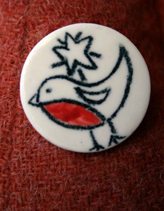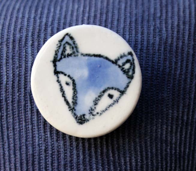 Each one is made from a circle of porcelain which has been bisque fired. I then hand draw a little design onto the porcelain surface, colour with vibrant red and cool blue underglaze and then coat with a stoneware transparent glaze, turning the whole piece white and hiding the freshly drawn illustration. This will only be revealed again once fired for a second time, then the clay has been transformed into a strong glossy disc, the underglaze colours enriched by the glaze.