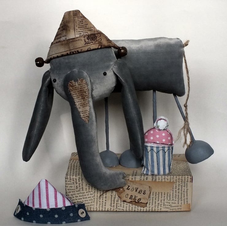 Elephant is made from velvet with papier mache feet and legs.The wooden base is covered in pages from a novel with a little coffee dyed tag.I couldn't decide which hat i liked best so... there are two !One is made from coffee dyed newspaper print linen along with the heart on the trunk and the other is linen with vintage linen buttons. The cup cake has been machine embroidered onto white linen then stuffed.