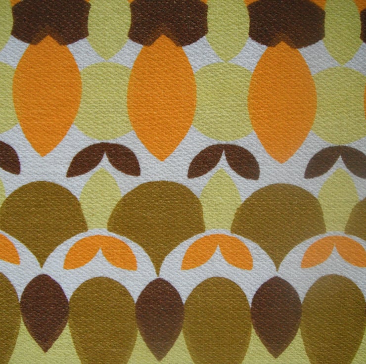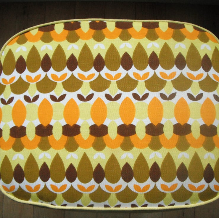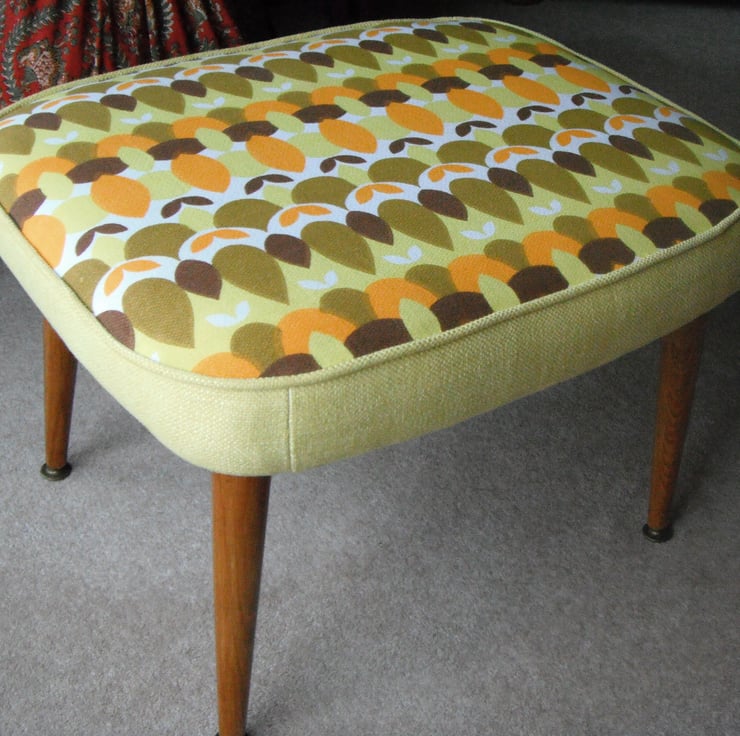 This is a vintage stool that has been lovingly restored to give it a new lease of life, having had all its fillings and covers renewed. The main fabric on the stool seat is a genuine retro screen printed cotton fabric, probably from the 1960s. It is in great condition considering its age and it features an overlapping geometric pattern reminescent of leafs and flowers in a vibrant combination of yellow, orange, green, brown and white. The sides are upholstered in a contrasting contemporary tweedy yellow fabric. It also features pipping along its edge in the later fabric.