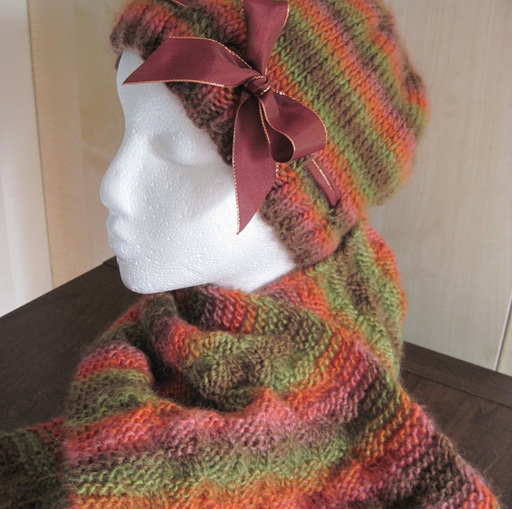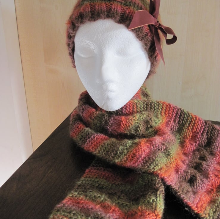 This is a lovely and warm, hand knitted, hat and scarf set in autumnal colours. The yarn, when knitted, gives a random striped pattern design.