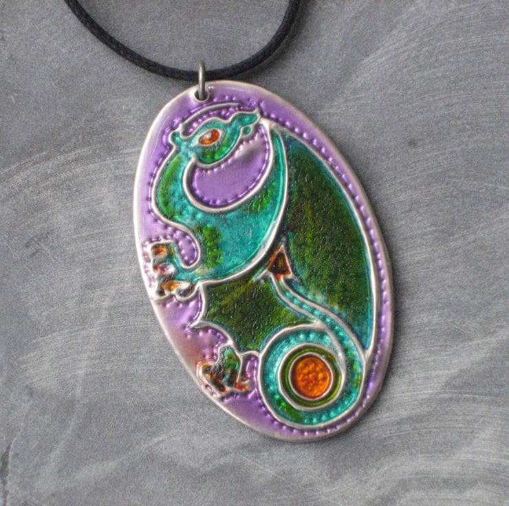 Was £15 now £10. This pendant has been individually hand-made in shiny modern pewter,and has been coloured with cold enamels and lacquer. Measuring 60 x37mm, it is supplied with a black fabric lace.