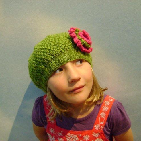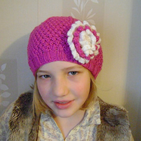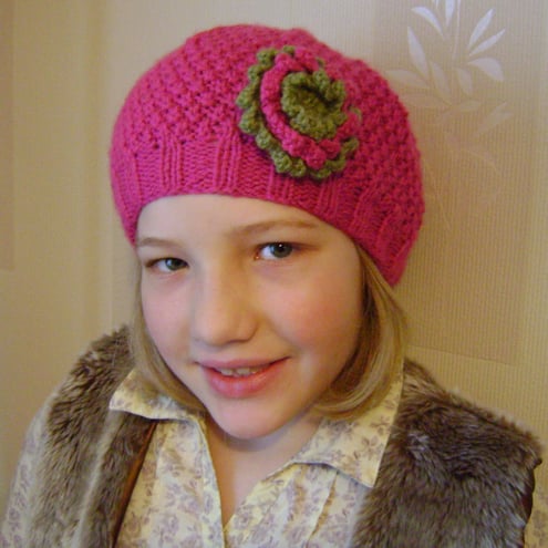 A lovely pretty hat for little girls, it has a detachable flower brooch in strawberry pink and olive green.