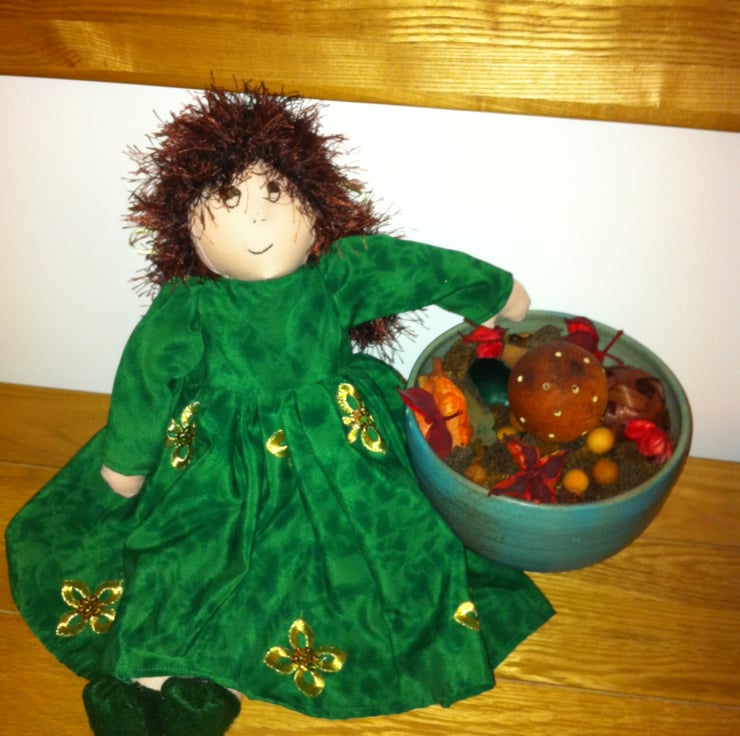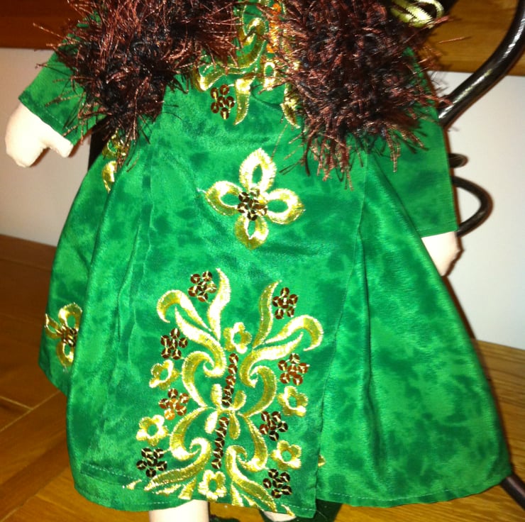 Erin is an Irish doll. She has dark auburn hair, tied up in bunches and is wearing a green dress, embroidered with gold, and green shoes decorated with sequins. The back of the dress is beautiful (see small picture.)