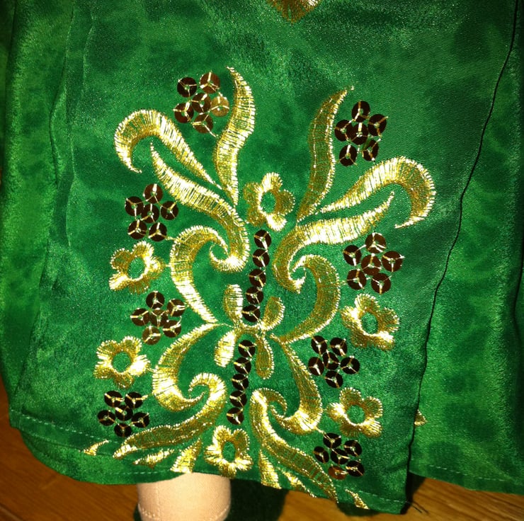 I saw this piece of fabric in a shop and it reminded me of River Dance and all of those gorgeous Irish dancing costumes. I love Irish dancing and I think the costumes are really beautiful. I used the highly embroidered part of the fabric to make the cape on the back of the dress and made a velvet carry bag to match the outfit.