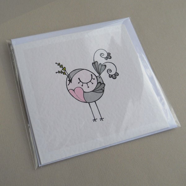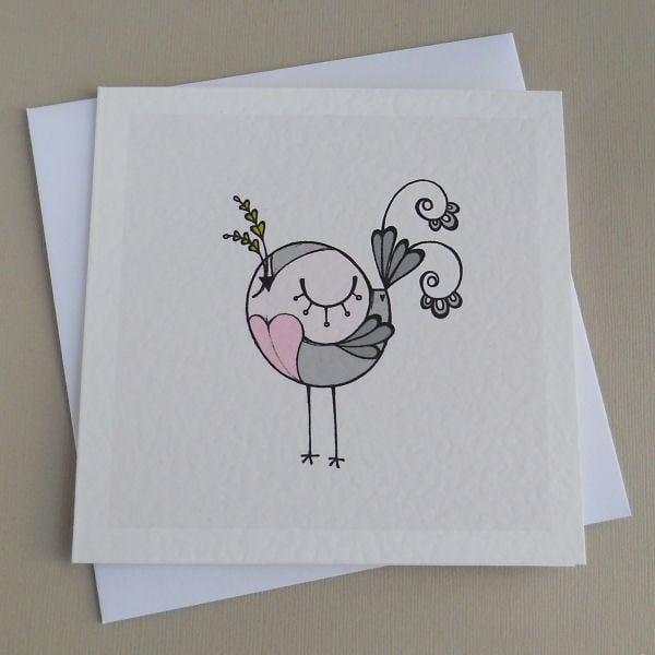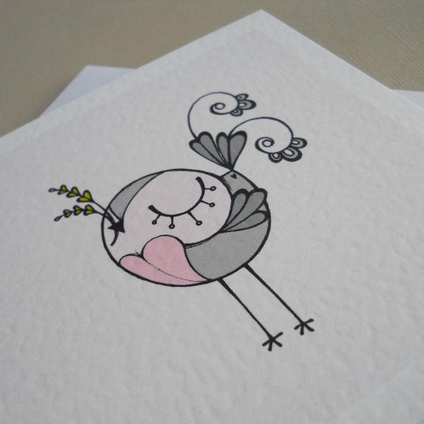 this design is from one of my original hand drawings; drawn in pen and ink, scanned in and coloured digitally, it is then printed onto good quality textured white card (300gsm).