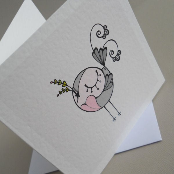 a lovely card for mothers day, featuring a cute baby bird proudly holding out a little sprig of plants, especially picked for mum!