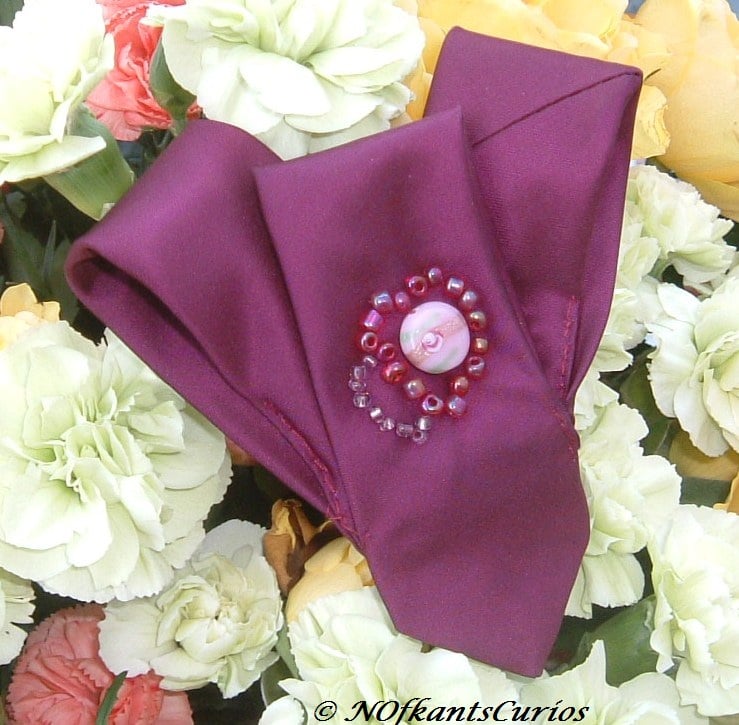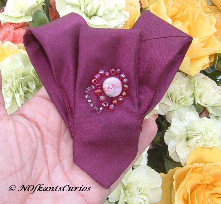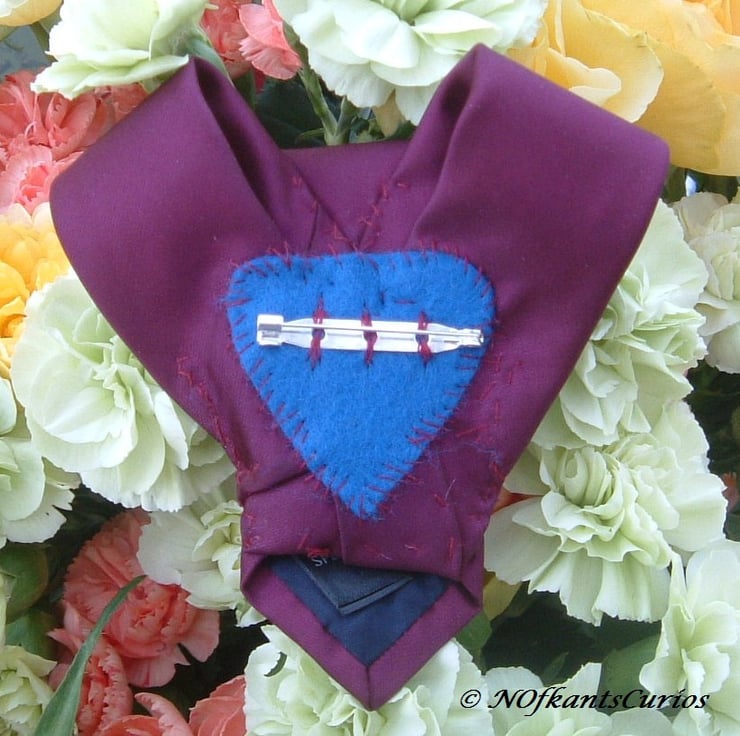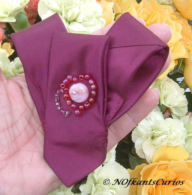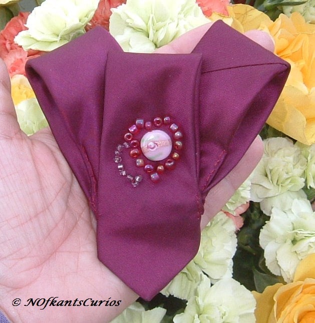 Tied to my Heart! Is a wonderful, very textural, structural and 3D corsage, fashioned in the form of a rich burgundy bow shaped heart, with hand sewn glass beads in the centre, in an overlapping heart design.