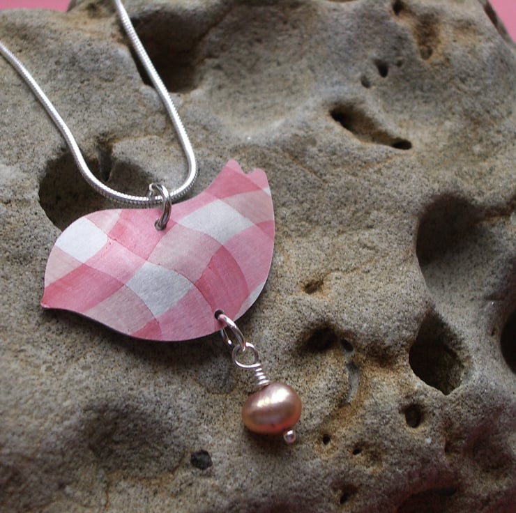 I have added a peach coloured freshwater pearl on a sterling silver pin, which dangles from a sterling silver jump ring. The chain which may vary from the one in the picture is also sterling silver and is 16" long.