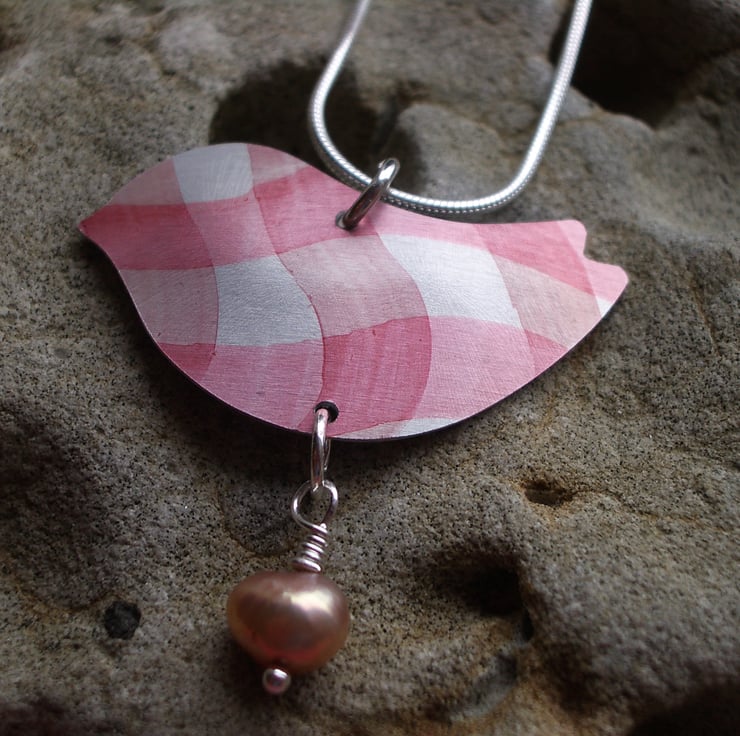 This sweet little bird is made from aluminium which I have coloured and then sealed so that the dye becomes a permanent part of the metal. I then saw pierce the bird shape by hand.