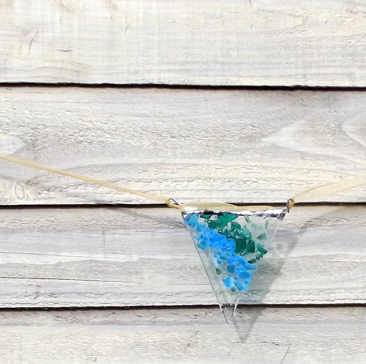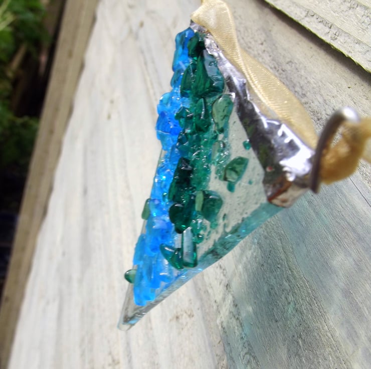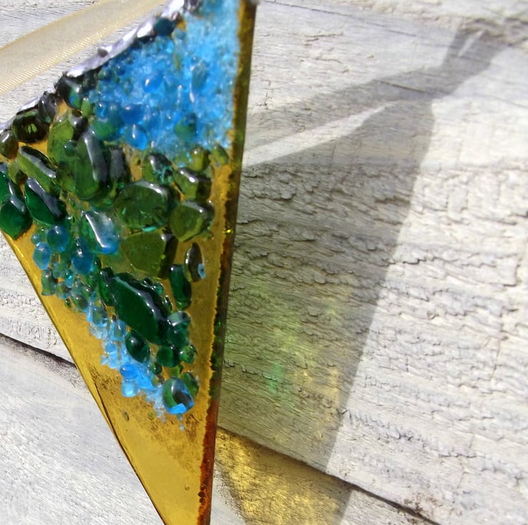 My first ever fused glass bunting! These 7 cm flags are really vibrant and eye catching, bejewelled with many small pieces of glass called frit which I have carefully placed on the glass and then heated in my kiln until the glass melts slightly and fuses together.