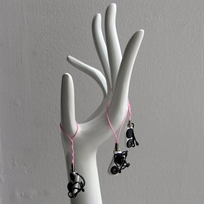 A tiny version of the classic ipod made from Patarev which has a slightly rubbery texture. On a pink cord.