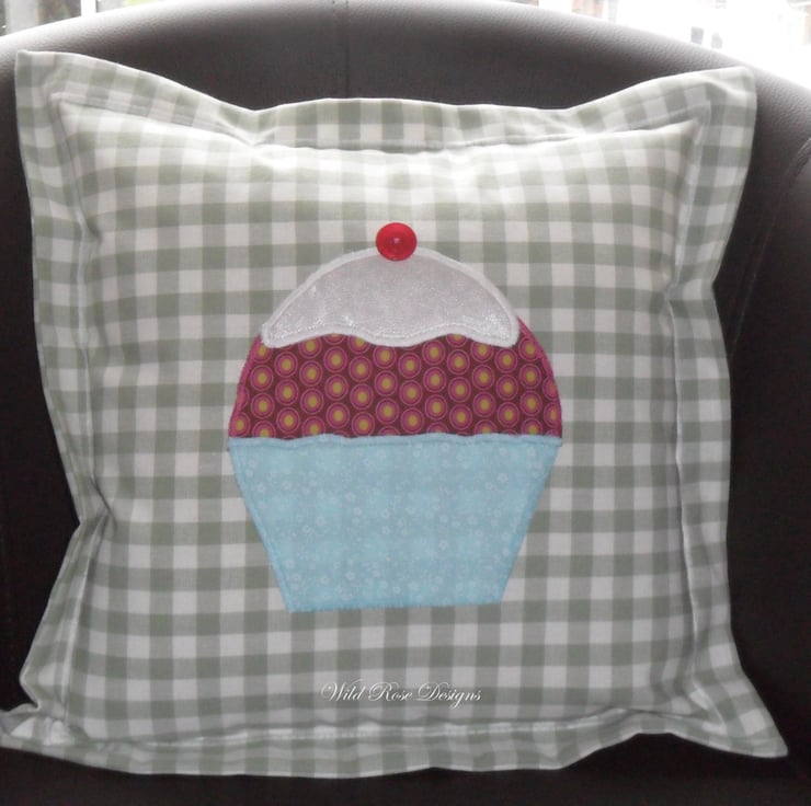 This cushion is part of a set of four cushions, all in a green Laura Ashley gingham and all with a cupcake motive.