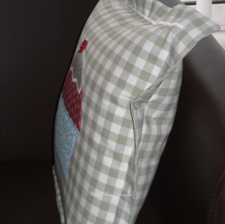 The cover is made in a green Laura Ashley cotton gingham check, and has an appliqued cupcake on the front with a button 'cherry' on top. The cupcakes on the four cushions in this set are all in different fabrics. The cushion cover has a concealed zip on the reverse and cushion pad is included.