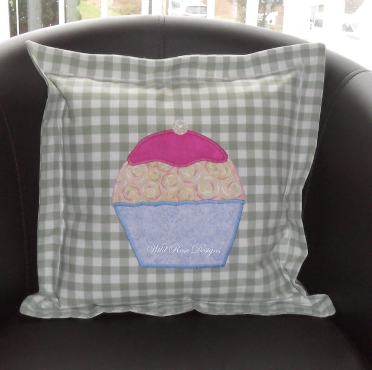 This cushion is part of a set of four cushions, all in a green Laura Ashley gingham and all with a cupcake motive.