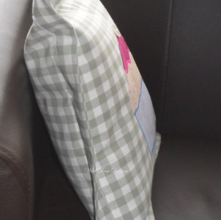 The cover is made in a green Laura Ashley cotton gingham check, and has an appliqued cupcake on the front with a button 'cherry' on top. The cupcakes on the four cushions in this set are all in different fabrics. The cushion cover has a concealed zip on the reverse and cushion pad is included.