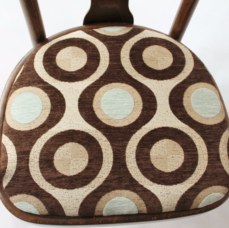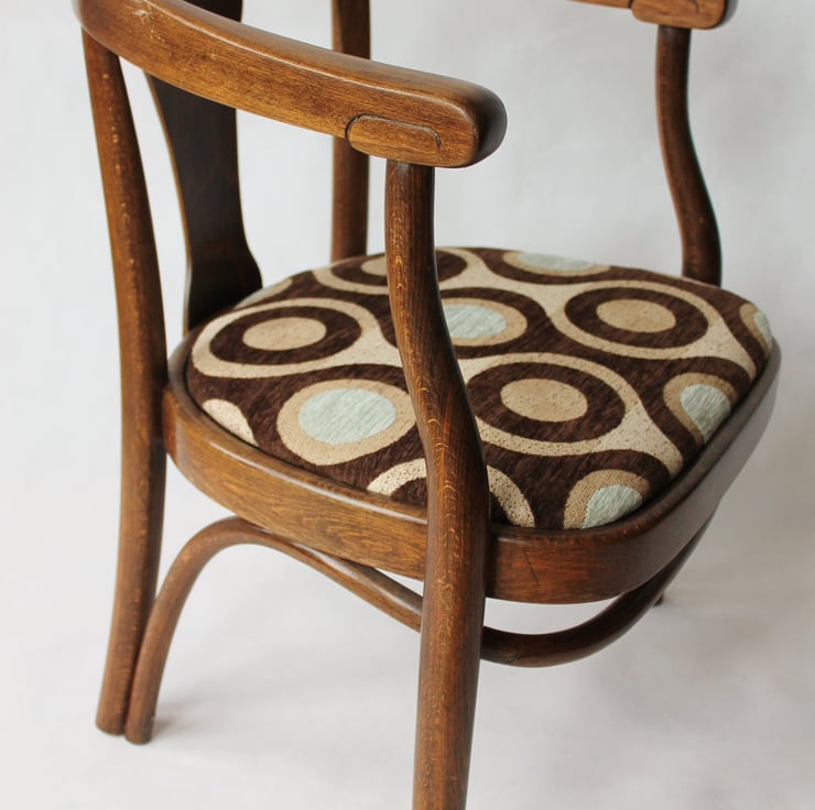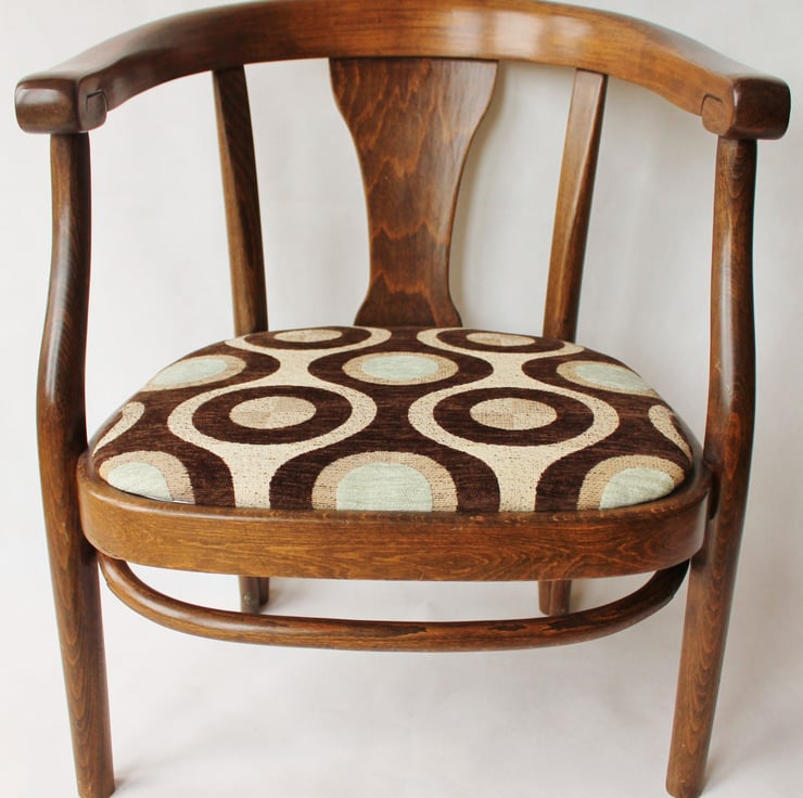 As you may have noticed from our shop, we love vintage and antique furniture and absolutely love retro fabrics, so we try to incorporate them as much as we can in our creations. We like to look through antique markets and auctions mainly for little gems of the past, in this way also re-using and recycling furniture and other materials. We also like to keep an eye for good quality contemporary materials which patterns show an influence from past eras. This is the case for the fabric used to re-upholster this armchair which is a modern piece that we think enhances and complements this antique, whilst modernising it at the same time.