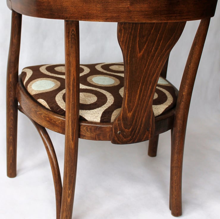 The seat has been re-upholstered using a striking modern material to bring it up-to-date. The frame has been polished and waxed to bring up the lovely original patina of the wood.