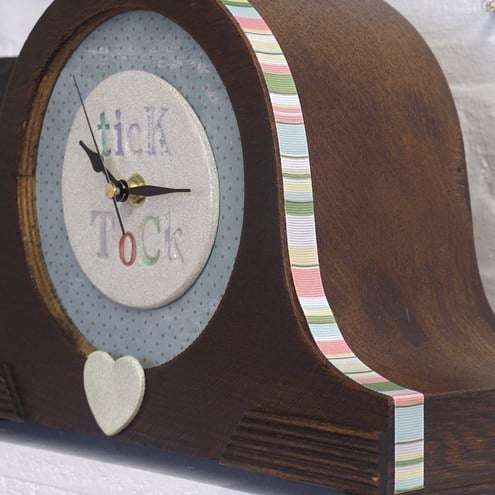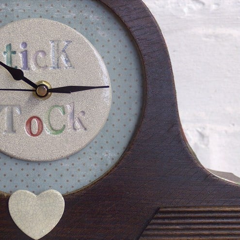 Would you like to re-home a tired, broken old clock that's been given a new life? This is a vintage wooden clock case, enhanced by my hand-made ceramic clock face with 'Tick Tock' stamped into the clay with my vintage stamps. The letters are coloured with a lovely, pastel coloured underglaze, there is a vintage style paper background as decoration .