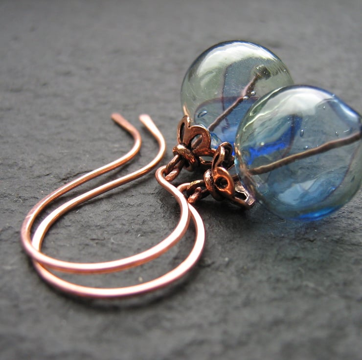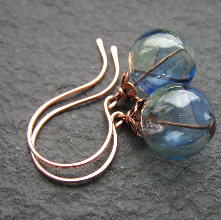 Blown glass beads (12mm) of green and blue coupled with handcrafted copper ear wires make these lovely drop earrings.