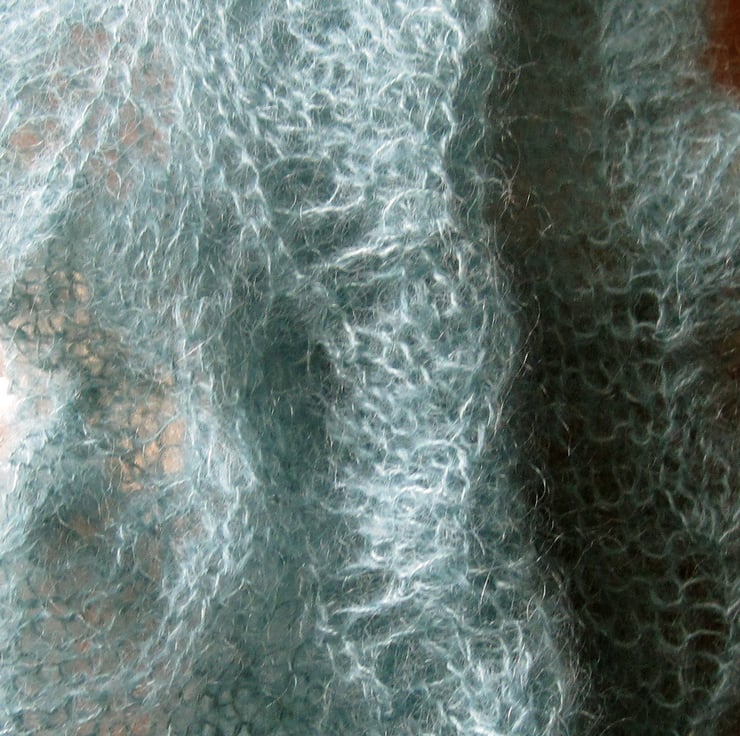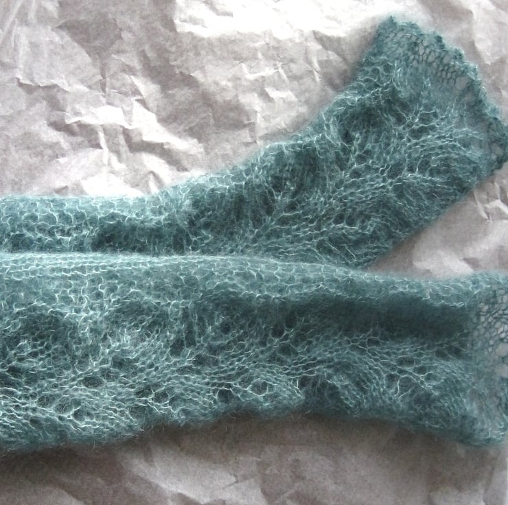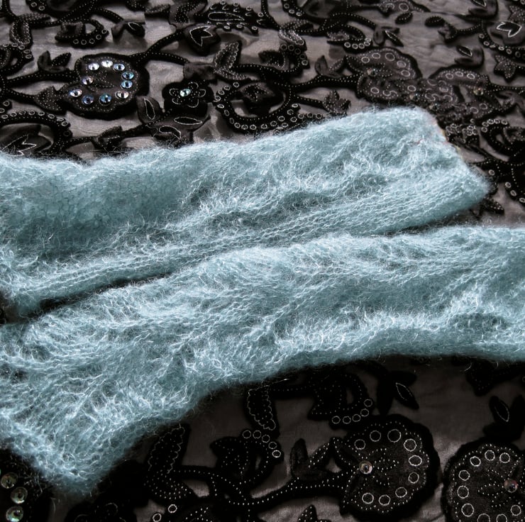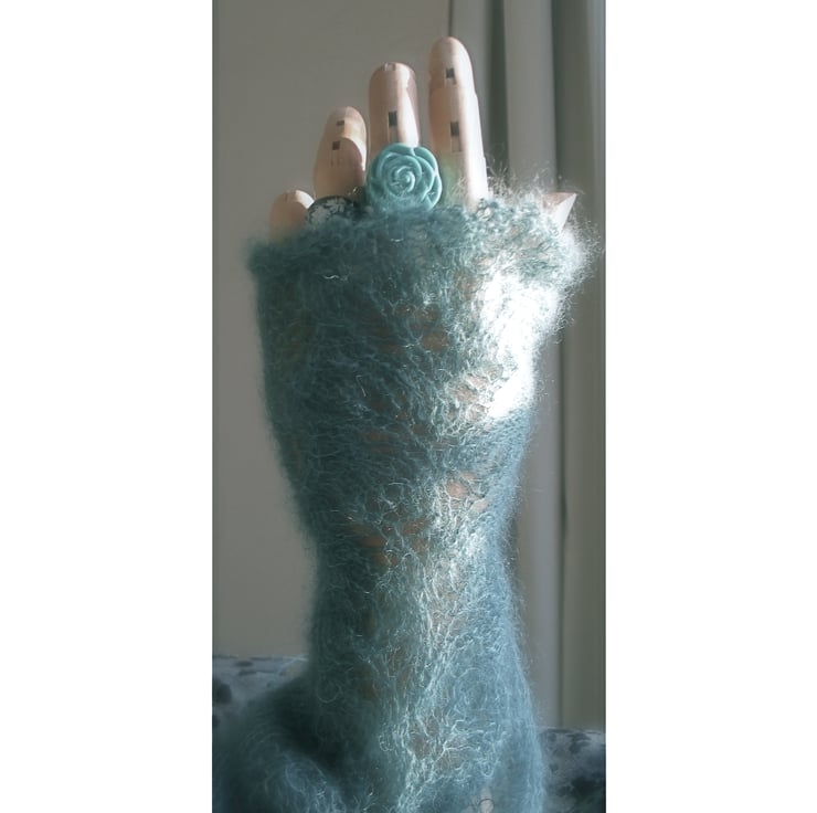 A delicate pair of armwarmers, hand knitted (by me) and gossamer fine. The colour is a delicate pastel turquoise. These are really light but ideal for extra warmth and a touch of class.